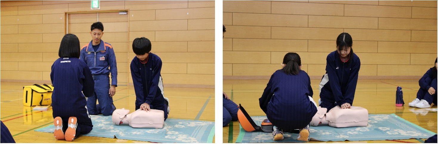 | 2年体育で救命講習の授業が行われました。新篠津消防署の方を講師にお招きし、AEDの使い方など、実践的に学ぶことができました。新中生にはこれから人の命を救うことのできる人に成長してほしいと願っています。 |