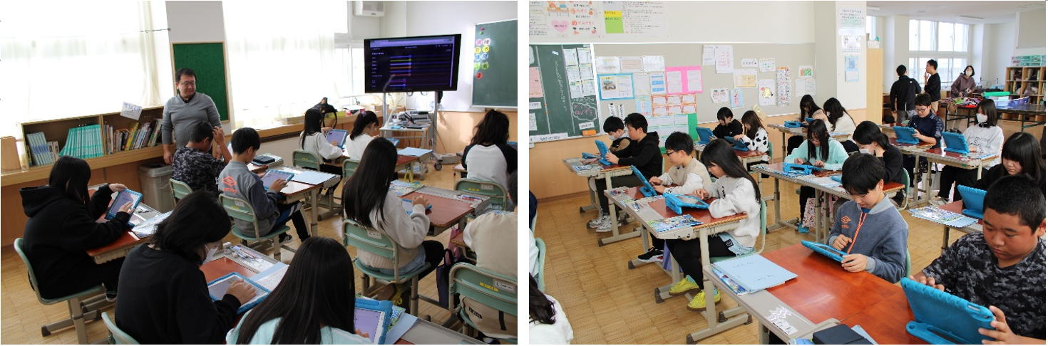 | 小学校への乗り入れ授業(小6英語)が行われています。中学校の英語担当の指導の下、世界の国名を楽しそうに発音し、英語科と社会科の関連について感心の声を上げる児童の声もあがっていました。 |