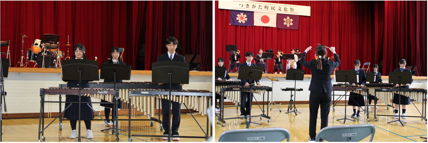 | 月形町民文化祭に音楽部が出演しました。今回は3年生が引退し、初めて1年生のみで参加した舞台でした。しかし、全員ものおじすることなく堂々とした演奏で、会場は大きな拍手にわきました。また、月形中吹奏楽部と共同で「ふるさと」を演奏し、近隣町村との交流を行うことができました。 |