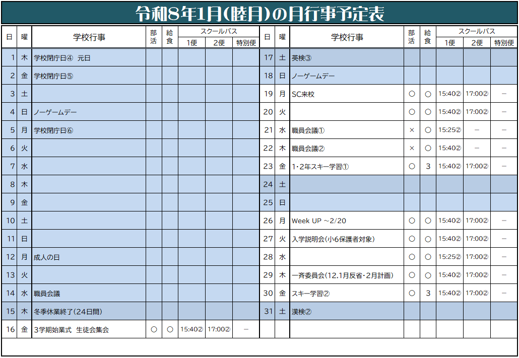 | 本日は冬休み学習会が行われました。全学年から学習に意欲的な生徒が多数参加しました。それぞれ自主的に課題を準備して取り組み、ときには仲間と教え合う様子も見られました。※学習会は1月13日にも行う予定です。 2026年も新中生全員が力を身につける学校教育活動を展開していきます。皆様、来年もどうぞよろしくお願いします。 |