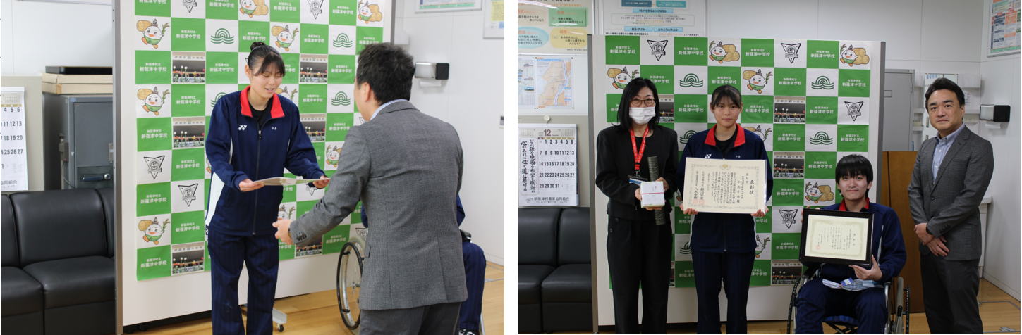 | 人権作文コンクールで入賞した2名の生徒の表彰式が行われました。本校生徒が、昨年に引き続き奨励賞を受賞させていただきました。これからも高い人権意識を持ち、良好な仲間作りに励む新中生として成長を続けてほしいと思います。 |