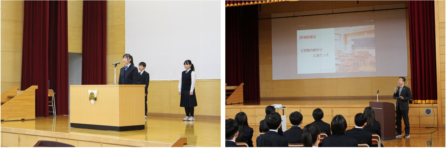 | 2学期終業式を迎えました。今回は式前に表彰伝達式も行いました。また、各学年からは2学期の成果と課題が発表され、3学期に向けて期待が持てる集会となりました。冬休み中は心身に英気を養い、また1月に元気な姿で合えることを期待しています。 |
