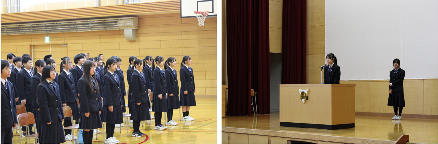 | 3学期始業式が行われました。新年を迎え、どの学年の生徒も元気に登校し、心身ともにたくましくなった様子が見られました。各学年の代表からは抱負が語られ、式後の生徒会集会では各委員長からも3学期の活動について説明がありました。 |